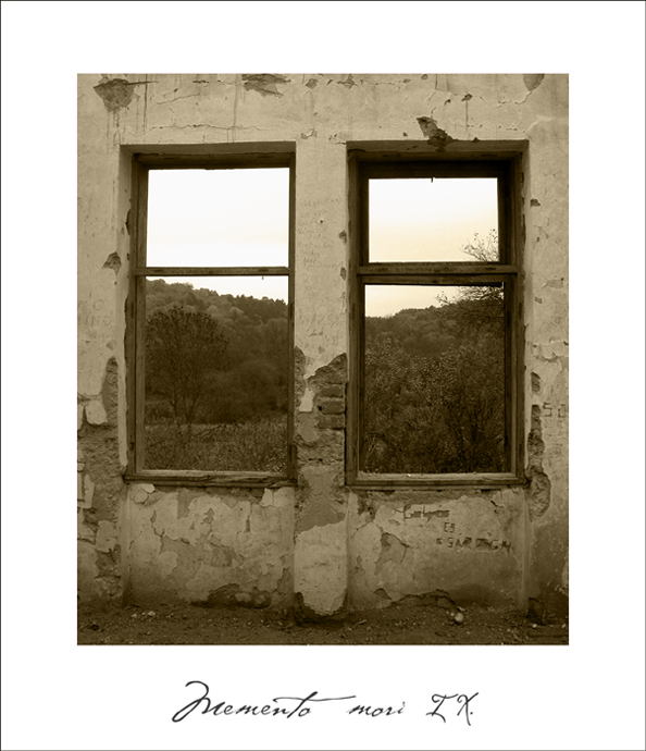 Az iskola megmaradt tűzfalában található ablakokból egy pillantás a falura. (Vagyis ahol a falu egykor állt.) Szemben a fa mellett készült a VI.-os kép.